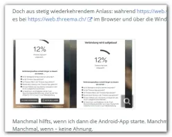 Doch aus stetig wiederkehrendem Anlass: während https://web.whatsapp.com sofort eine Verbindung herstellt, so muss ich es bei https://web.threema.ch/ im Browser und über die Windows-Desktop-App häufig mehrfach versuchen: