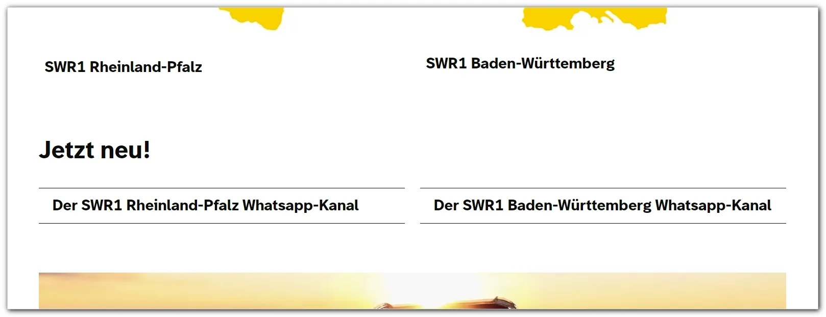 Ts, nachdem ich auf https://www.swr3.de/aktuell/servic…rtstag-100.html gelandet war, hatte ich gerade "interessehalber" bei SWR3 nachfragen wollen, ob es generell auch Nicht-nur-WhatsApp-Kanäle von SWR3 geben würde, um in Kontakt zu treten oder Infos zu erhalten etc.. Tatsächlich: man erreicht den Sender nicht nur per WÄ, sondern auch Signal: