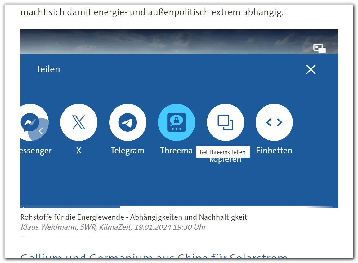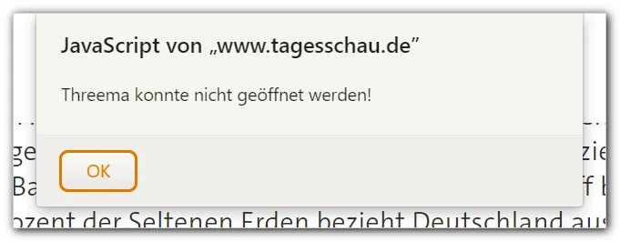 Funktioniert bei mir, obwohl das Alert trotzdem kommt. Offenbar sauschlecht programmiert. Merkwürdigerweise kann man nur Videos auf Threema teilen aber keine Artikel.