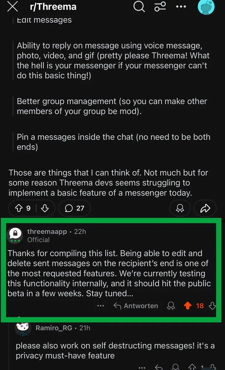 In der neuesten iOS Version von Threema kann man bereits Code für eine "Delete / Edit message" Funktion entdecken.